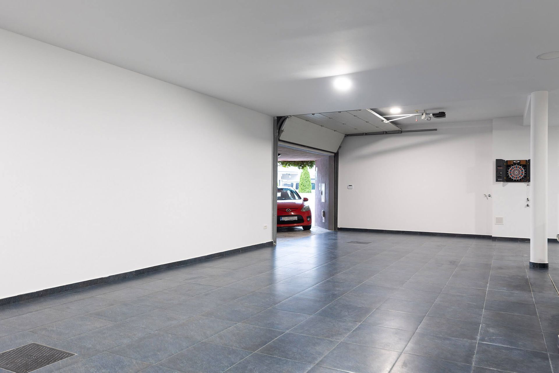A spacious garage with enough room to comfortably fit four cars. It's not just for parking—the space doubles as a recreational area featuring a ping pong table and a dartboard, perfect for casual games and friendly competitions.