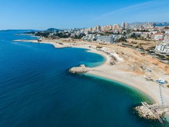 A modern beach with numerous amenities such as water sports, sun loungers, and restaurants.